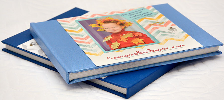 Фотокнига № 107 в твердом переплёте с фотовставкой на обложке. Имеет форзацы из дизайнерской бумаги.